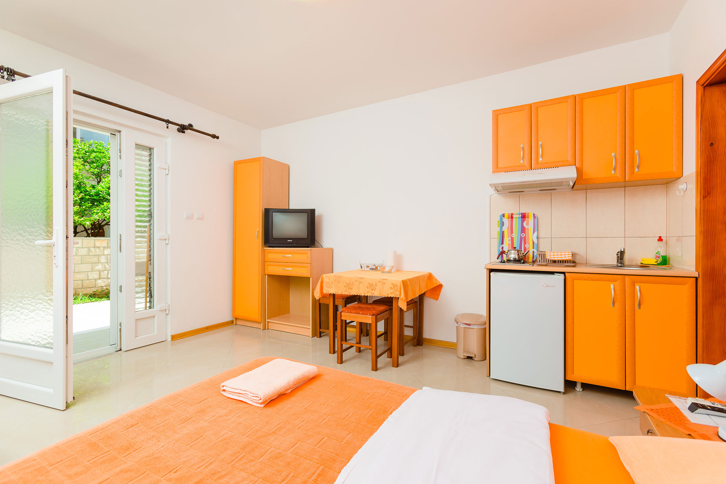 Studio (21m²) se nalazi na prizemlju. Pored sopstvene terase, gosti imaju na raspolaganju privatno dvorište koje je posebno interesanto za najmlađe. U apartmanu se nalazi veliki bračni ležaj i fotelja koja se adaptira u pomoćni ležaj. Kuhinja je kompletno opremljena posuđem i priborom za kuvanje. Gostima su na raspolaganju oprema za peglanje, fen i krevetac za bebu (ukoliko je potreban).