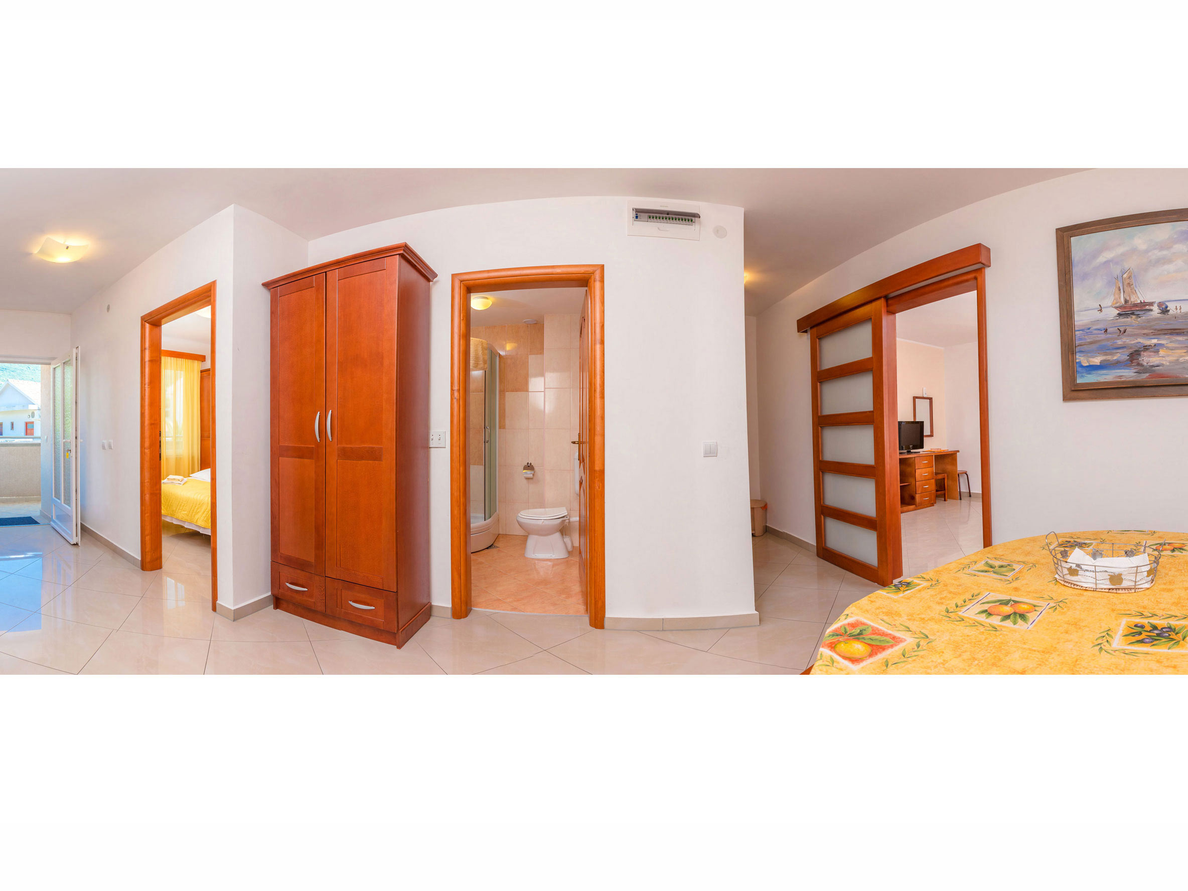 Žuti apartmani su najveći apartmani koje imamo u ponudi (56m², 4-5 osoba) i imaju balkon sa pogledom na more. U spavaćoj sobi se nalazi bračni krevet dok su u dnevnoj sobi sofa i fotelja na razvlačenje koje se mogu adaptirati u tri dodatna ležaja. Kuhinja sa frižiderom, pločom i mikrotalasnom je kompletno opremljena posuđem i priborom za kuvanje.Peškiri, posteljina i redovno čišćenje su uključeni u cijenu. Krevetac za bebu je je besplatan i dostupan na upit.